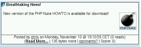 The themeindex() function in theme.php is also the place where the “number of reads” is printed after the “posted by” part (see How to remove the number of reads in News). Thus, if you want to remove the number of reads in the News module and your theme is NukeNews, for example, you have to edit themes/NukeNews/theme.php with a decent text editor (see also Chapter 11), find the line