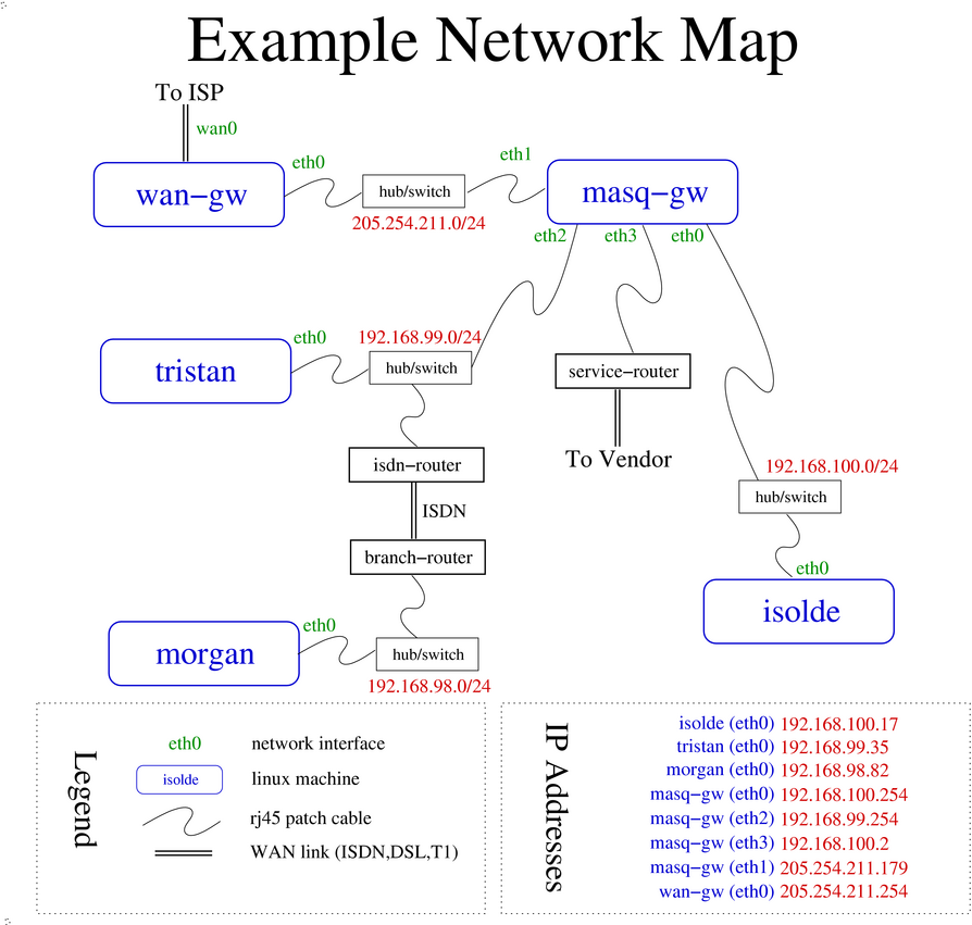 The LAN shown above is a common leaf-network scenario for business offices. Frequently, there are one or two machines on a public network segment, a masquerading firewall, and one or more networks behind the masquerading firewall. Please do not consider this example network the only way to interconnect devices. The above is one method of designing a network--there are many practical issues to weigh in network design. I am deliberately skirting the issue of network design here and proposing an example network similar to or a superset of a commonly found network design.